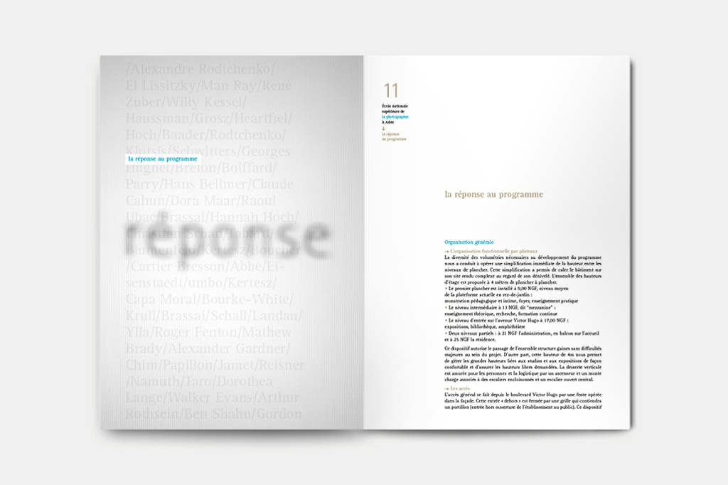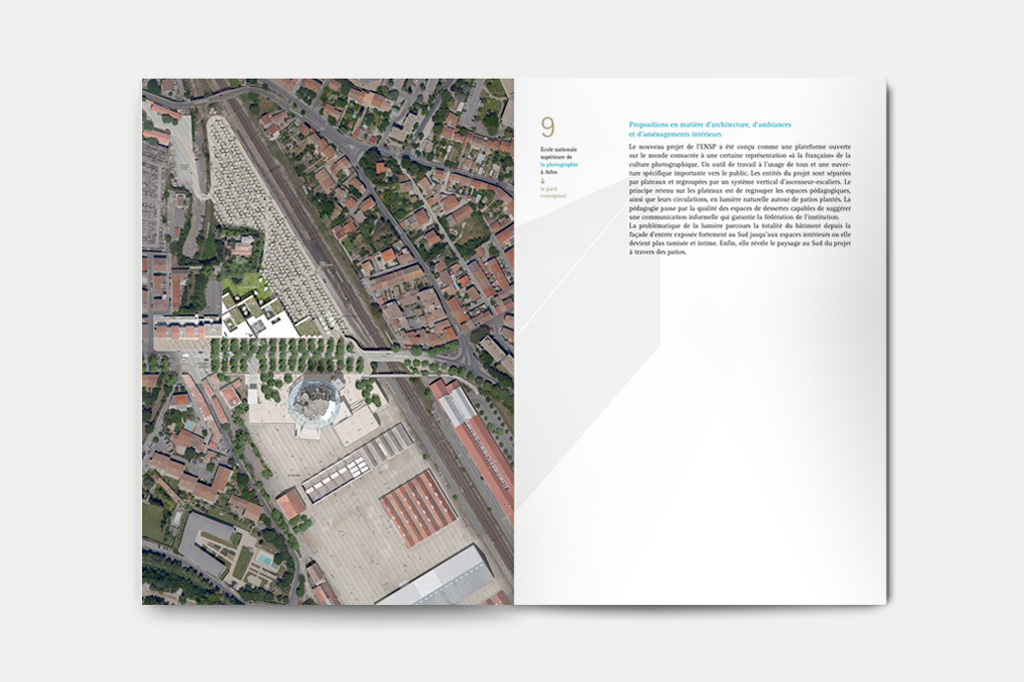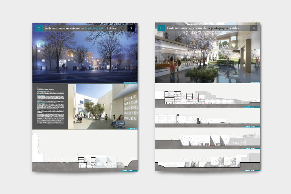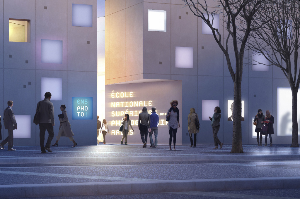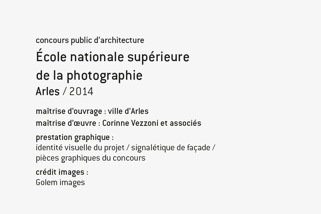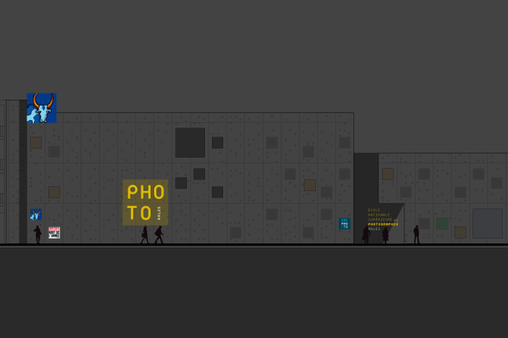 En réponse au concours public d’architecture, la recherche graphique sur l’identité visuelle de l’École nationale supérieure de la photographie s’est orientée vers la lumière. L’effet évanescent de celle-ci révèle, peu à peu, l’image et le projet architectural.