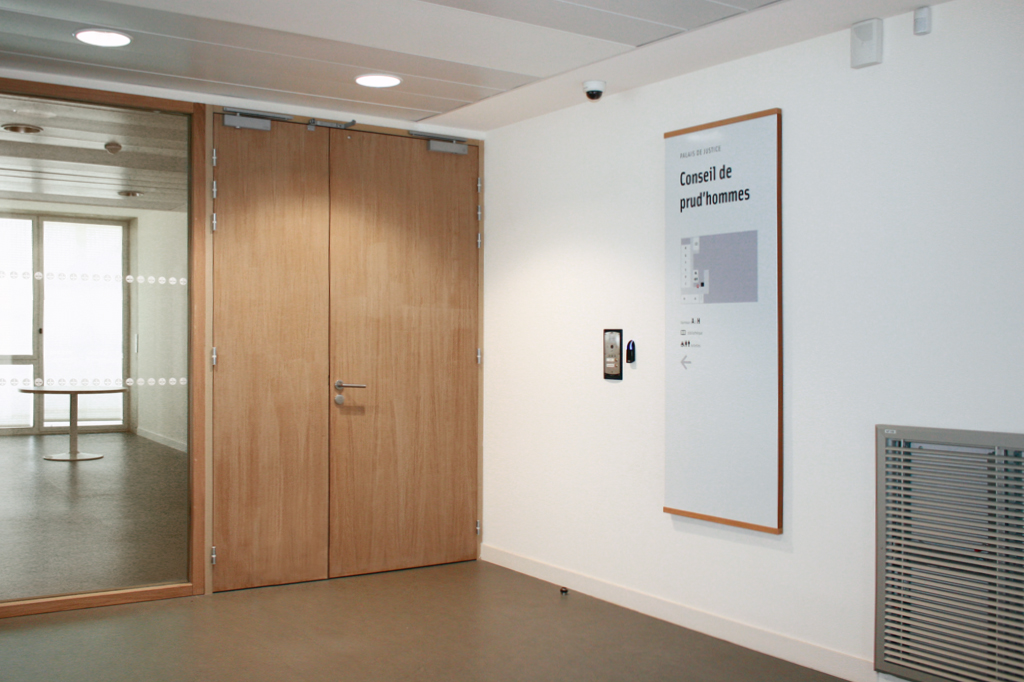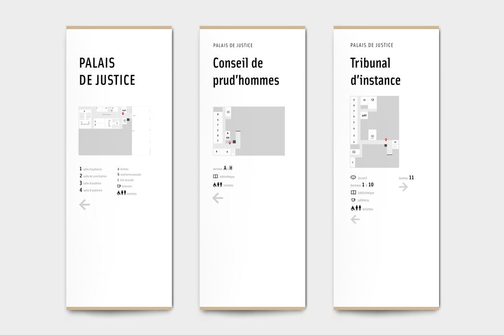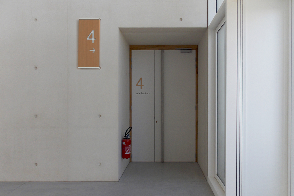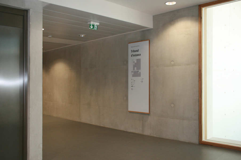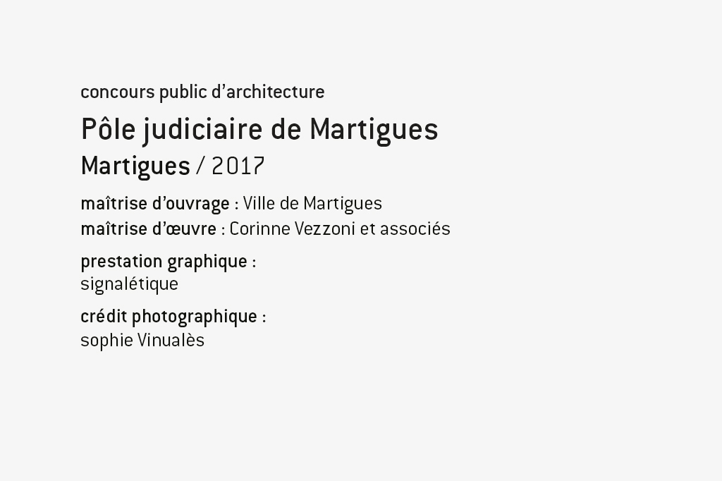 Le Pôle judiciaire de Martigues regroupe le Palais de justice, le tribunal d’instance, la Maison de la justice et du droit et les Prud’hommes. La conception de la signalétique découle du projet architectural. Les proportions des supports, le choix des matériaux, les teintes, la typographie et les pictogrammes sont en résonance formelle avec des éléments du bâtiment.
